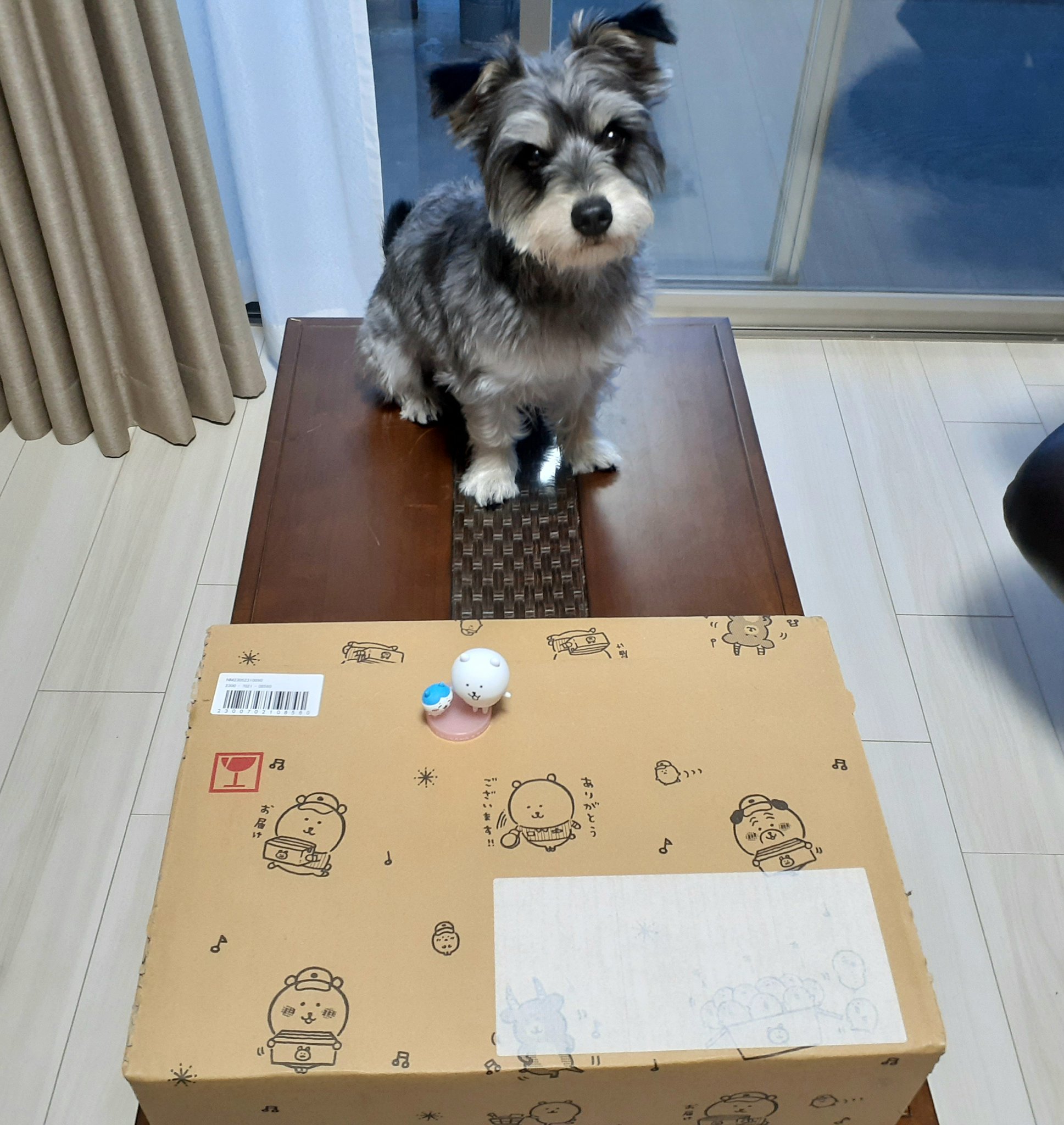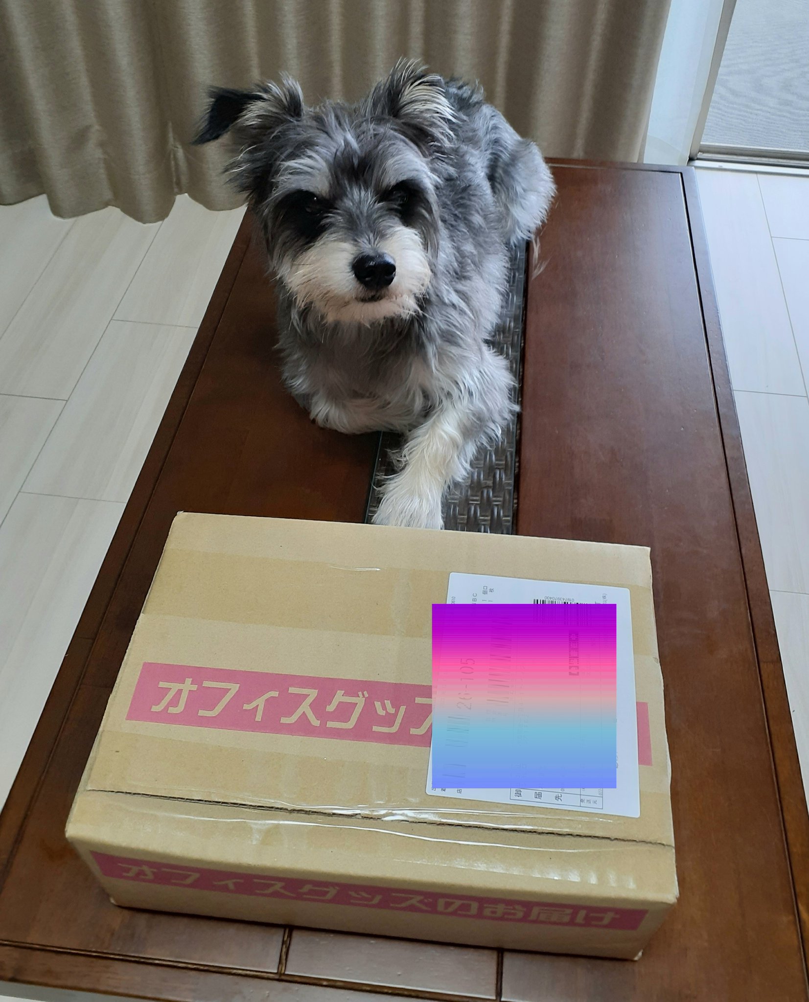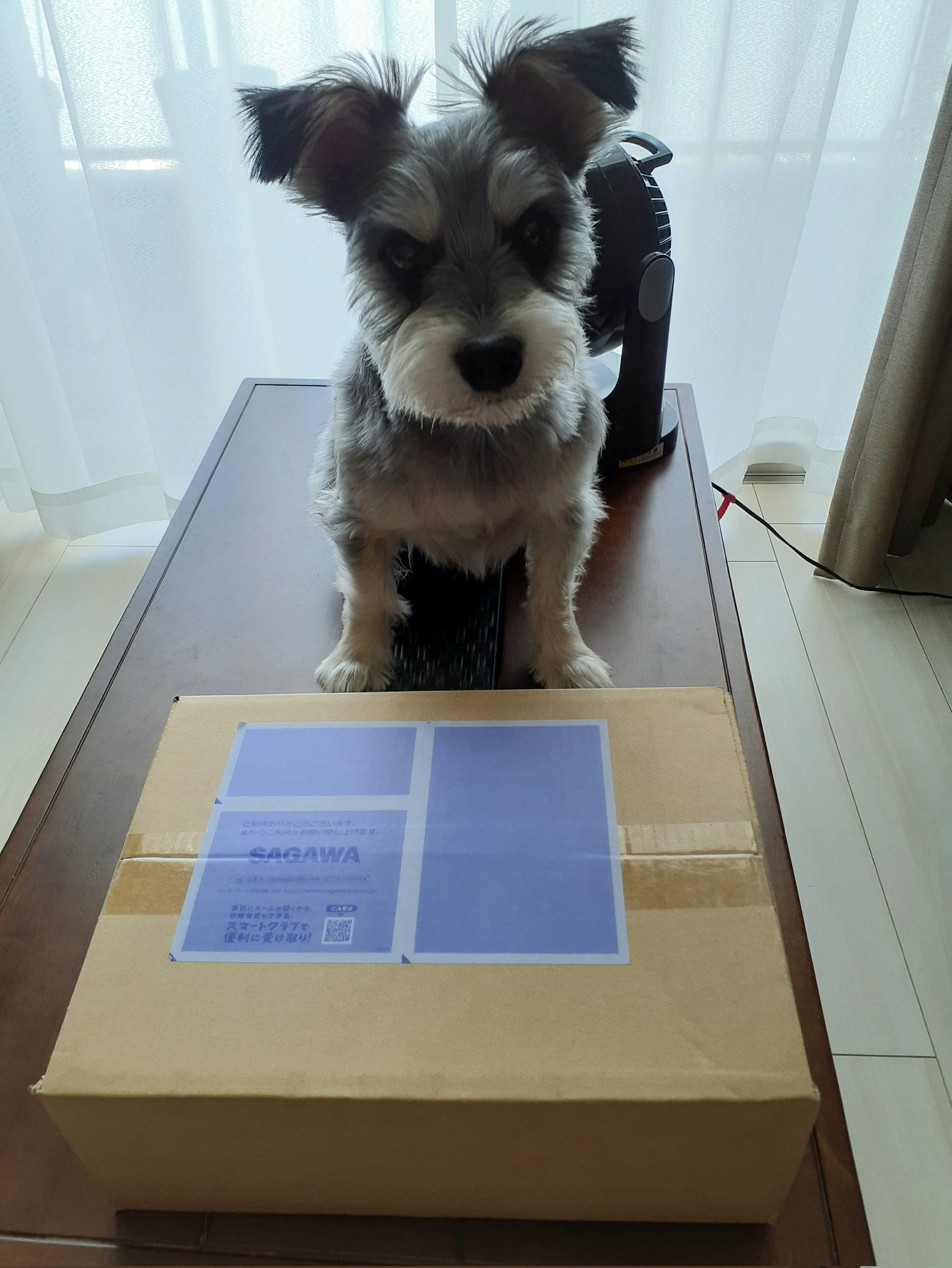 サマーカットがだいぶ伸びてきた犬と届いた荷物