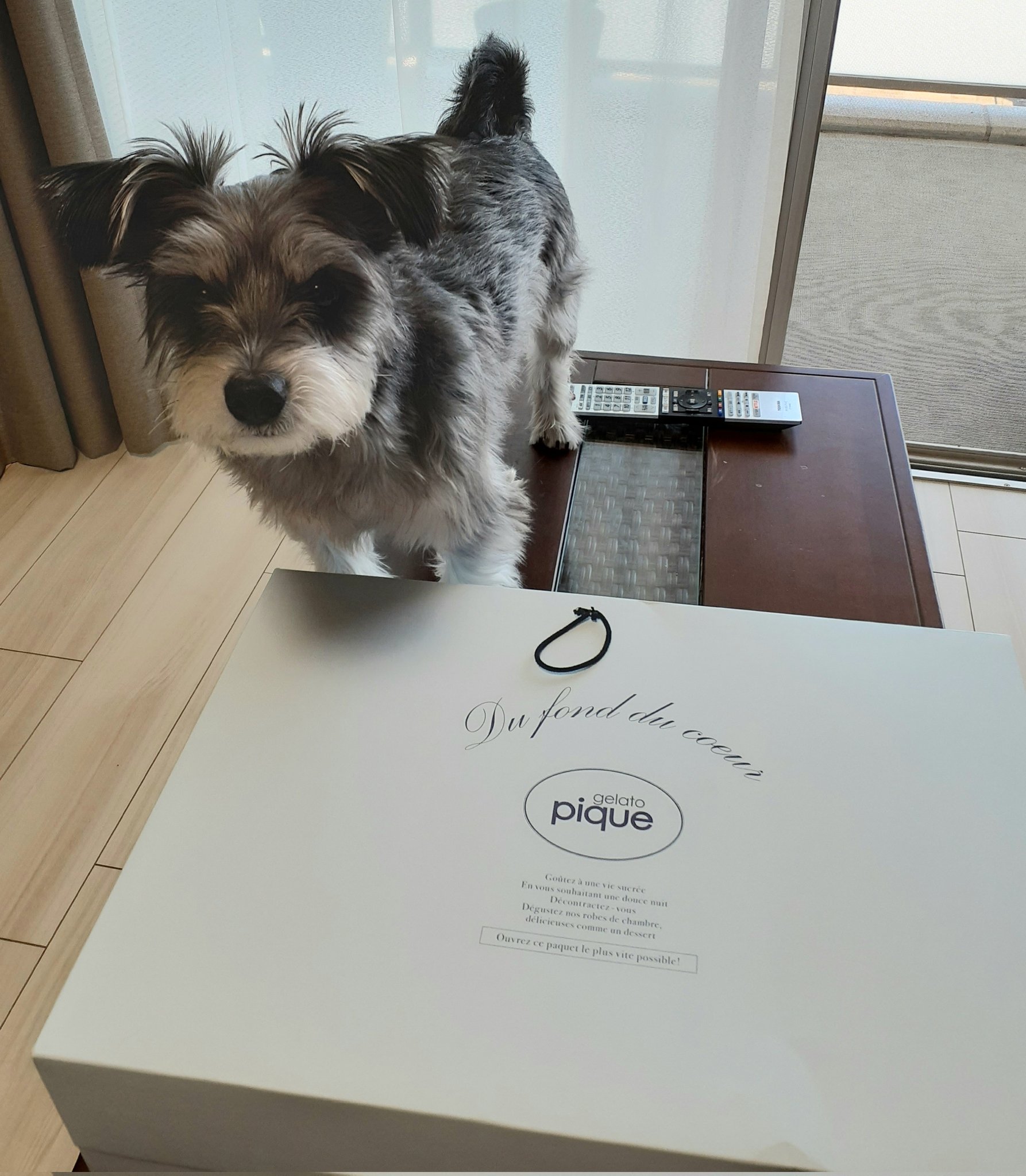荷物がくると「これはぼくのおもちゃでは??」という顔をしてやってくる犬